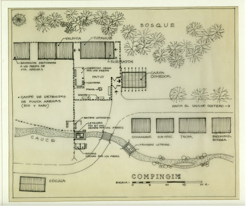 Campo de concentración Compingim. Dibujo del arquitecto y ex preso político Miguel Lawner Steiman, realizado en el año 1976. Fondo Miguel Lawner Steiman, Archivo Museo de la Memoria.