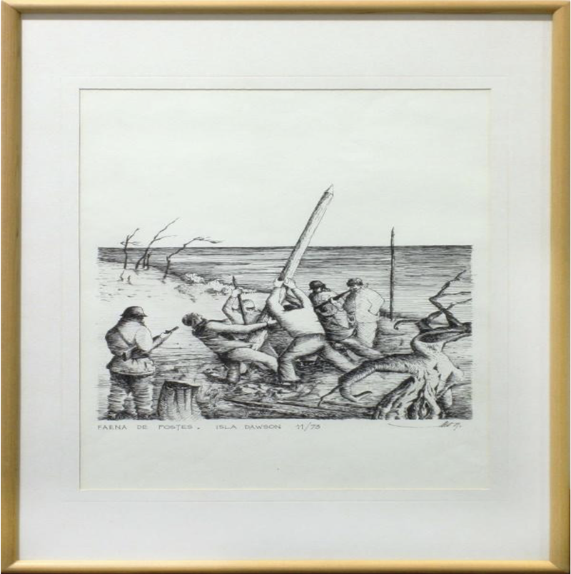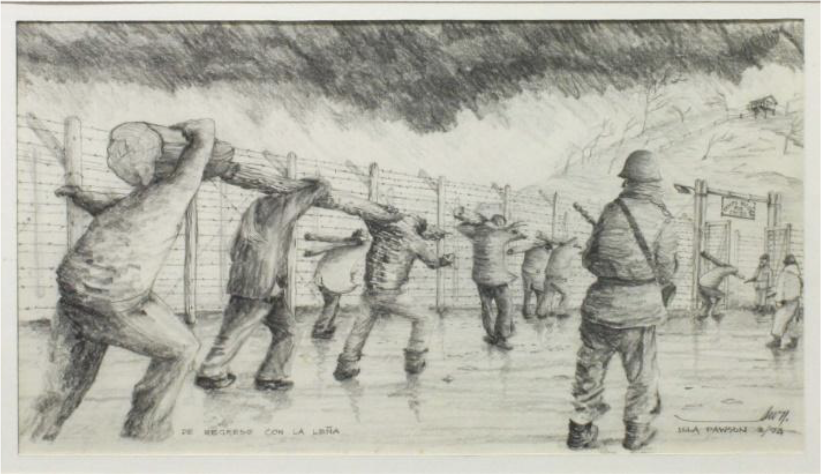 Faena de postes. Dibujo realizado por Miguel Lawner (1973). Archivo Museo de la Memoria.