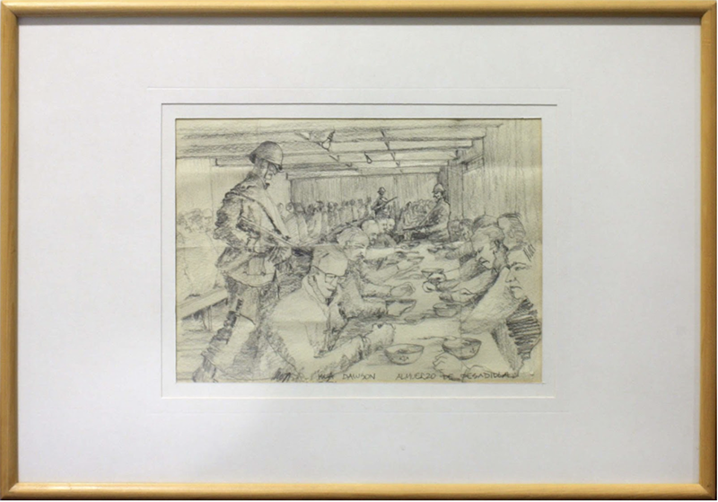 Almuerzo de pesadilla. Vista del comedor del campo de concentración de Isla Dawson, dibujada por Miguel Lawner Steiman (1974). Fondo Miguel Lawner Steiman, Archivo Museo de la Memoria..