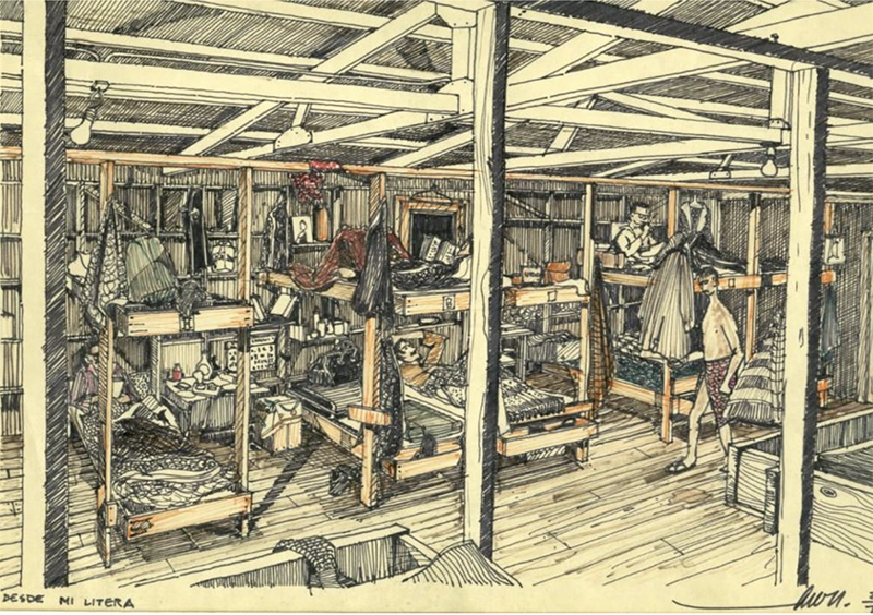 Desde mi litera. Dibujo realizado por Miguel Lawner Steiman en el campo de concentración de Isla Dawson (1974). Fondo Miguel Lawner Steiman, Archivo Museo de la Memoria.