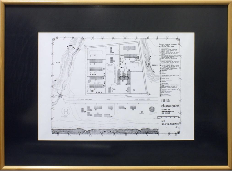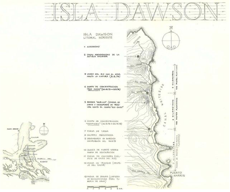 Campo de Concentración Isla DawsonMapa de la Isla Dawson, sus asentamientos y poblados, y sus campos de concentración. Dibujo de Miguel Lawner (1976), en Lawner, M. (2003), La vida a pesar de todo. LOM, p. 5.