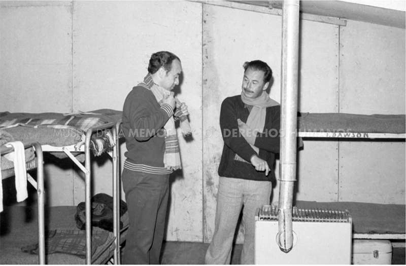 Dos prisioneros conversando. Fotografía sacada en el campo de concentración de Isla Dawson (1974). Fondo Abel Esquivel Querci, Archivo Museo de la Memoria.