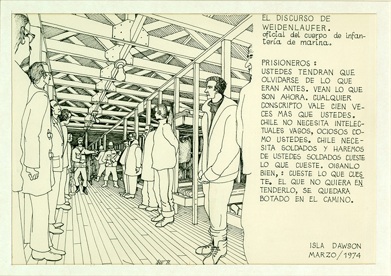 El discurso de Weidenlaufer. Dibujo realizado por Miguel Lawner Steiman (1976). Fondo Miguel Lawner Steiman, Archivo Museo de la Memoria.